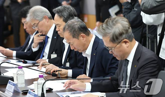 (서울=뉴스1) 임세영 기자 = 함영주 하나금융지주 회장, 임종룡 우리금융지주 회장 등이 7일 오전 서울 종로구 정부서울청사에서 열린 금융상황 점검회의에 참석해 자리하고 있다.