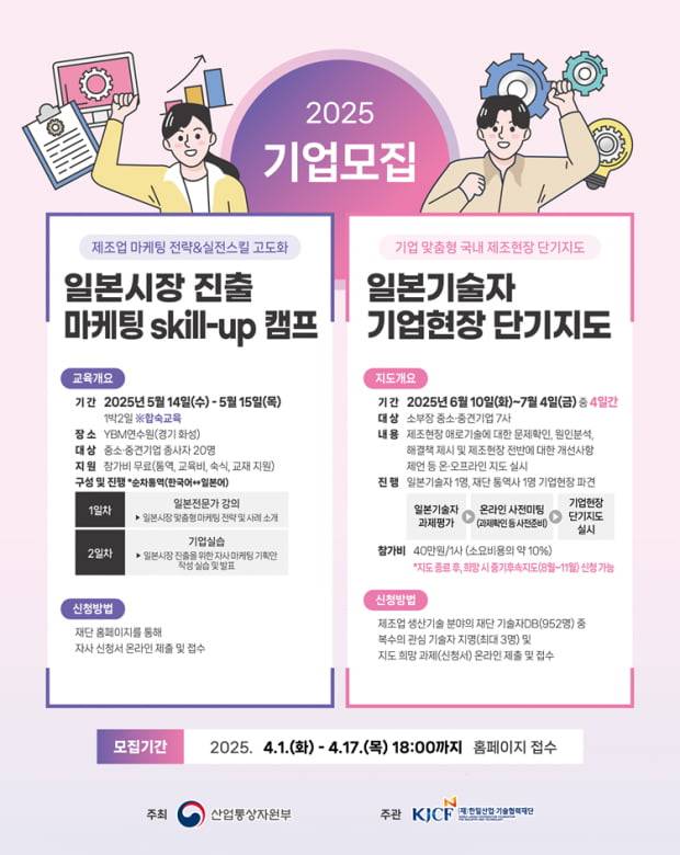 한일산업기술협력재단은 중소·중견 제조기업을 대상으로 "일본기술자 기업현장 단기지도"와 "일본시장 진출 마케팅 스킬업(Skill-Up) 캠프"의 참여기업을 각각 모집하고 있다.