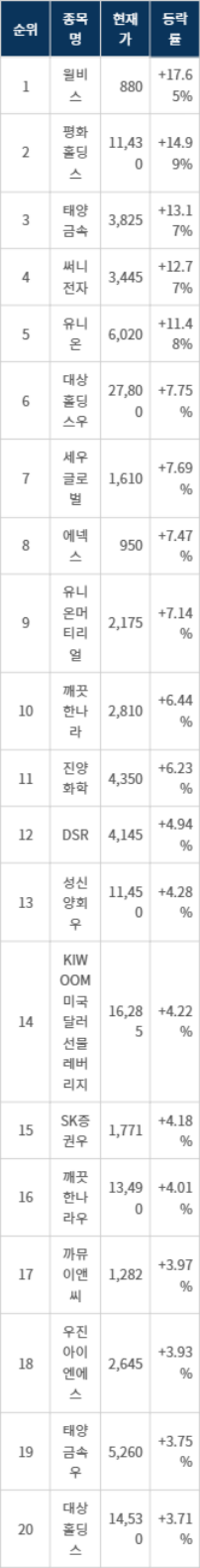 6위 대상홀딩스우(084695)는 현재가 27,800원으로 7.75% 상승 중이다. 7위 세우글로벌(013000)은 현재가 1,610원으로 7.69% 상승 중이다. 8위 에넥스(011090)는 현재가 950원으로 7.47% 상승 중이다. 9위 유니온머티리얼(047400)은 현재가 2,175원으로 7.14% 상승 중이다. 10위 깨끗한나라(004540)는 현재가 2,810원으로 6.44% 상승 중이다.