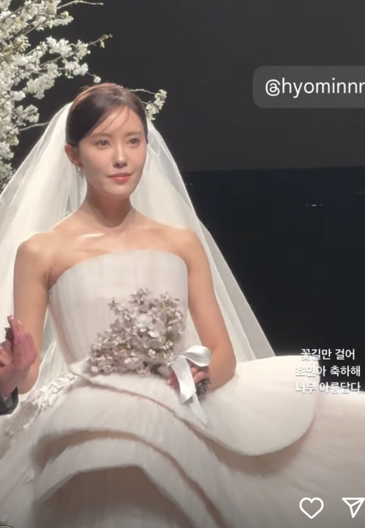 이와 함께 동료 연예인들의 SNS를 통해 이날의 결혼식 현장이 일부 공개되기도 했다. 화려한 꽃으로 장식된 버진로드에서 모습을 드러낸 효민은 민소매 웨딩드레스를 입고 등장, 순백의 면사포를 착용한 채 아름다운 미모를 자랑했다.