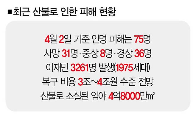 지난 3월 국민의 불안은 최고조에 달했다. 국내외 불확실성이 커진 상황에서 우리나라 역사상 최대 규모의 산불까지 번졌기 때문이다. 산불의 규모가 컸던 만큼 피해 규모도 상당하다. 행정안전부에 따르면 2일 기준 인명 피해는 75명(사망 31명ㆍ중상 8명ㆍ경상 36명)이었고, 3261명(1975세대)의 이재민이 발생했다.