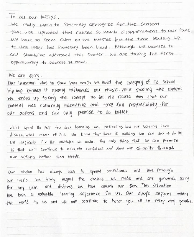 공개된 사진에서 멤버들은 "팬 여러분에게 큰 실망을 안겨드린 콘텐츠와 관련해 진심으로 사과드린다"며 "올드 스쿨 힙합이 우리의 음악에 큰 영향을 줬기 때문에 우리가 얼마나 사랑하는지 보여주는 것이 의도였다"고 설명했다.
