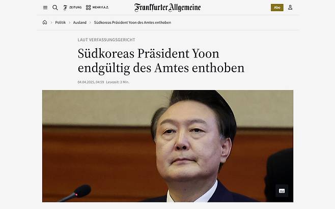 | ▲ 지난 4일 윤석열 대통령 탄핵 소식을 보도한 독일의 <프랑크푸르터 알게마이네> |
