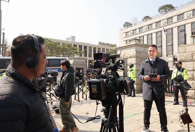 | ▲ 윤석열 대통령 탄핵심판 선고일인 4일 서울 종로구 헌법재판소 앞에서 외신기자들이 보도를 준비하고 있다. |