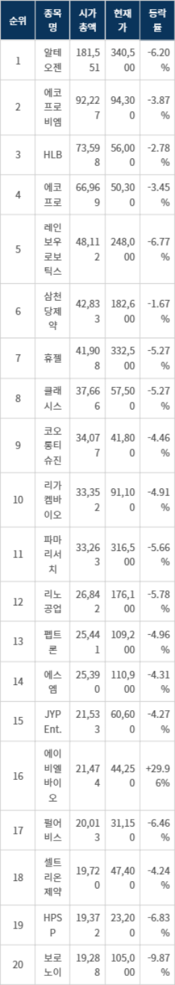 에코프로비엠(247540)과 에코프로(086520)는 각각 3.87%, 3.45%의 하락을 기록하고 있으며, HLB(028300)는 2.78% 하락하고 있다. 휴젤(145020)과 클래시스(214150)는 모두 5.27% 하락을 보이고 있으며, 코오롱티슈진(950160)과 리가켐바이오(141080)는 각각 4.46%, 4.91% 하락하고 있다.