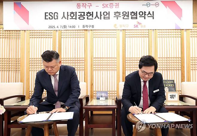 (서울=연합뉴스) 박일하 동작구청장(오른쪽)과 박삼규 SK증권 경영지원부문 대표가 7일 서울 동작구 노량진동 동작구청에서 열린 '서울 동작구-SK증권 ESG 사회공헌사업 후원협약식'에서 협약서에 서명하고 있다. 2025.4.7 [서울 동작구 제공. 재판매 및 DB 금지]