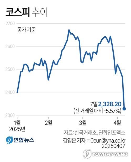 (서울=연합뉴스) 조민정 기자 = 코스피가 미국발 상호관세 충격으로 7일 5% 넘게 폭락해 단숨에 2,320대로 내려왔다.