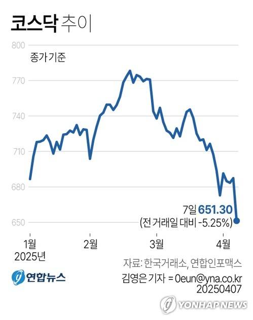 코스닥지수는 전장보다 36.09포인트(5.25%) 내린 651.30으로 마감해 올 들어 가장 낮은 수준을 기록했다. 코스닥 지수의 하락폭과 하락률 역시 작년 8월 5일 이후 가장 컸다.