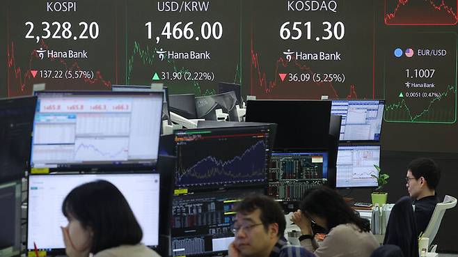 ▲ 코스피가 전장보다 137.22p(5.57%) 내린 2,328.20로 마감한 7일 오후 서울 중구 하나은행 딜링룸에서 딜러들이 업무를 보고 있다.