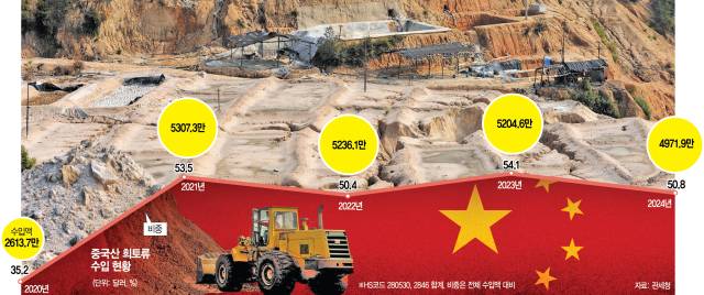 사정이 이렇다 보니 한국 희토류 수입 물량의 대중 의존도 역시 여전히 높은 편이다. 관세청에 따르면 2024년 우리나라의 희토류 화합물 수입액은 9790만 달러였는데 이 중 중국이 차지하는 비중이 50.8%(4970만 달러)에 육박했다. 2020년(35.2%)과 비교하면 대중 의존도가 16%포인트 가까이 상승했다. 중국이 수출통제를 가한 품목들의 지난해 수입액을 살펴봐도 이트륨 86.7%, 스칸듐 70.5% 등 대부분 중국산 비중이 가장 높았다.