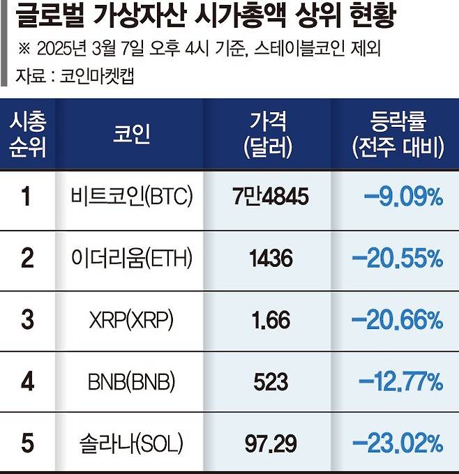 대장주 비트코인은 4월 들어 처음으로 8만달러선이 깨진 후 장중 7만5000달러선이 붕괴됐으며, 알트코인은 더욱 가파른 하락세를 보이고 있다.