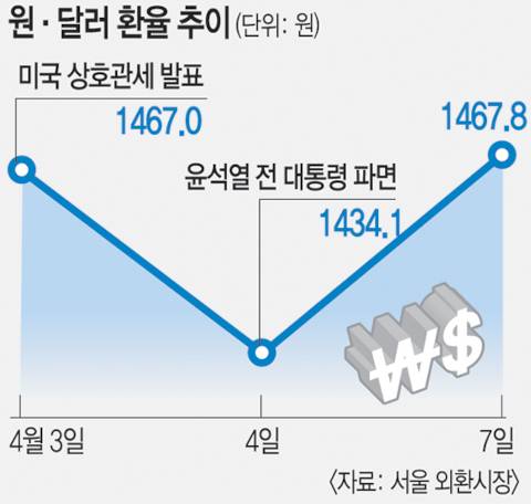 최근 국내 정치적 불확실성이 해소되며 급등했던 원화 가치는 미국발 관세 여파로 다시 떨어져 원·달러 환율이 장중 1470원 선까지 치솟았다.