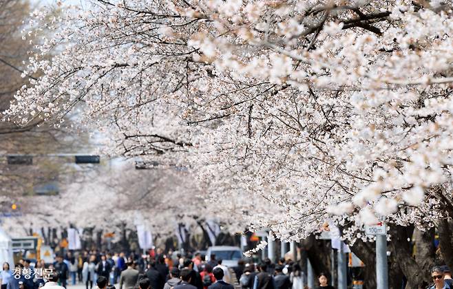 ‘여의도 봄꽃축제’ 개막을 하루 앞둔 7일 시민들이 벚꽃이 흐드러진 서울 여의도 윤중로를 산책하고 있다. 이날 서울은 낮 최고기온이 20도까지 오르는 포근한 날씨를 보였다.