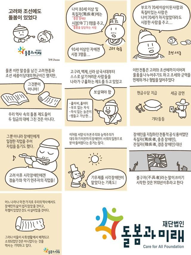 여기서 독질자는 중증 장애인을 말하고 시정은 돌봄을 담당하는 사람이라는 뜻이다. 이 기록을 통해 고려와 조선시대에도 돌봄 제도가 있었던 것을 알 수 있다. 노인과 장애인에게 마음을 쓴 고려 현종과 조선 세종이 당대의 현군이기는 했지만 이런 제도가 두 임금의 대에 그친 것은 아니다.