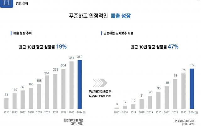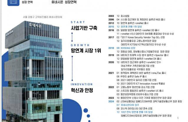 휴네시온은 망연계 시장 10년 연속 1위일 뿐 아니라 16년 연속 흑자 회사다. 설립 이래 16년간 매출 성장율이 21%에 달한다. 최근 8년간 무차입 경영을 하고 있다. 레퍼런스(고객 수)는 2100여 곳에 달한다.