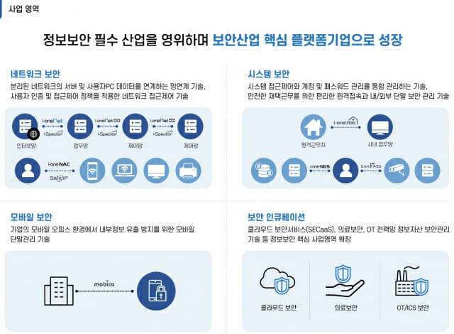 NAC 제품은 '아이원NAC(i-oneNAC)'이란 브랜드로 제공하고 있다. 이 제품은 2020년 마이더스AI(구 닉스테크)로부터 ‘세이프NAC(SafeNAC)’ 솔루션을 양수해 ‘아이원NAC(i-oneNAC)’으로 리브랜딩한 제품이다. 기술 고도화 및 체계적인 기술지원 서비스를 제공해 대규모 금융권 사업 수주에 성공했다. 전체 매출 중 NAC이 차지하는 비중은 아직 크지 않지만 제로 트러스트 기반 보안 모델 제시에 '아이원NAC'이 중요한 역할을 하고 있다.