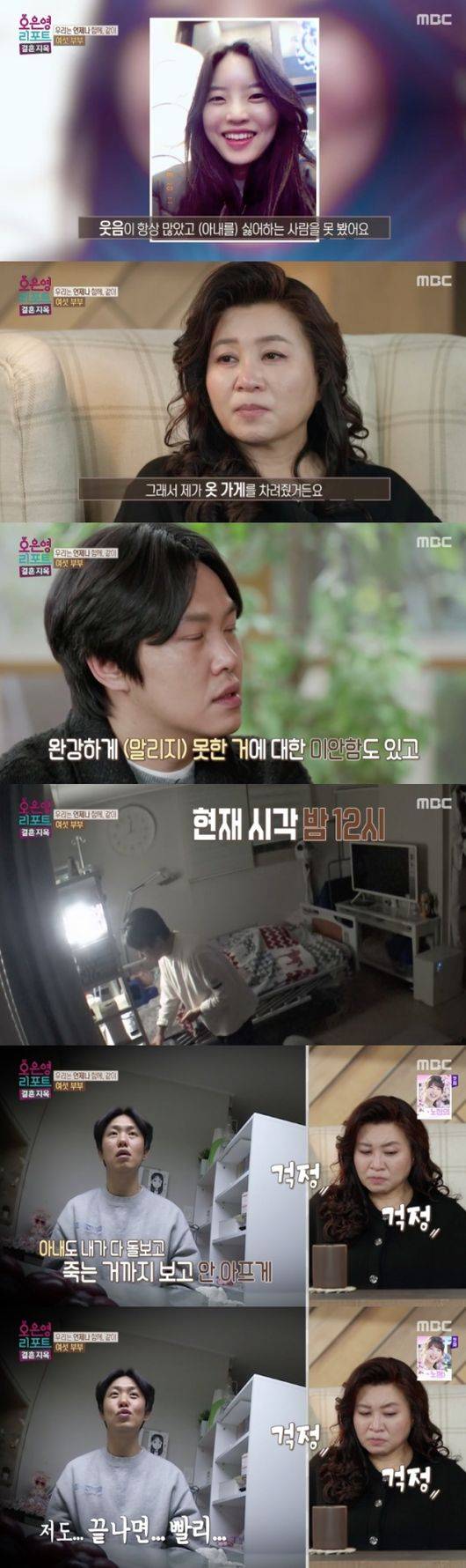 남편은 아내에 대해 “말을 예쁘게 하고 개그 세포도 엄청났고 웃겼다. 웃음이 항상 많았다. 싫어하는 사람을 못 봤다. 정말 좋은 사람이었다”라고 설명했다. 이어 “ 아픈 상황에서도 약으로 버티고 아이들을 봤다. 옷 가게를 운영하던 도중에 쓰러졌다. 무리해서 아픈 게 아니었을까. 완강하게 말리지 못한 것에 대한 미안함도 있다. 그때 말렸더라면, 아이를 덜 낳았으면, 나를 안 만났으면 하는 생각까지 가기도 한다”라며 자책하는 모습을 보였다.