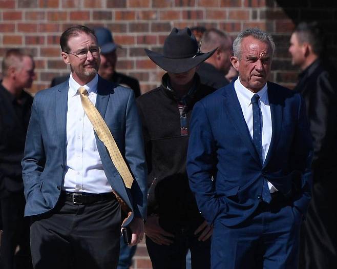 | 홍역 사망 어린이 장례식장 찾은 美 보건부 장관 로버트 케네디 주니어 미국 보건복지장관(오른쪽)이 6일 텍사스주 세미놀에서 최근 홍역으로 사망한 8세 아동의 장례식이 열린 교회에 등장했다. 취임 전 ‘백신 불신론자’였던 케네디 장관은 최근 홍역 백신을 맞지 않은 아동들이 잇따라 숨지자 백신 접종을 권고하고 있다. 세미놀=AP 뉴시스 |