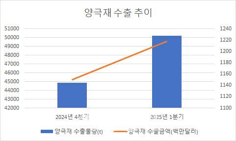 올해 1분기(1~3월) 전체 양극재 수출 물량은 총 5만202t으로 지난해 4분기(4만4866t)보다 11.9% 증가했고 수출액 또한 11억5073만달러에서 12억1814만달러로 5.6% 늘었다.