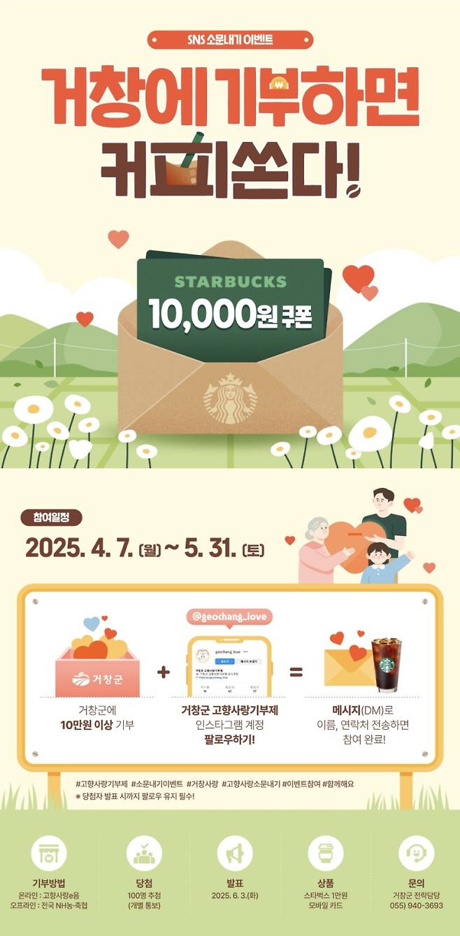 이벤트는 4월7일부터 5월31일 기간 중 거창군에 10만 원 이상 기부한 기부자를 대상으로 1만 원 상당의 커피 쿠폰을 추가로 증정하며, 무작위 추첨으로 당첨자 100명을 선정할 예정이다. 당첨자는 6월 3일 거창군 고향사랑기부제 인스타그램을 통해 확인할 수 있다.