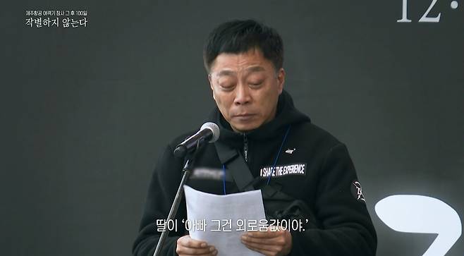 김성철씨가 제주항공 여객기 참사 추모제에서 읽은 편지의 내용입니다. 누군가를 잃은 그 슬픔과 외로움에 값이 있다는 생각은 그 누구도 하지 못했을 겁니다. 아마 딸은 슬픔에 잠겨 있는 아빠가 그리도 걱정이 됐나 봅니다.