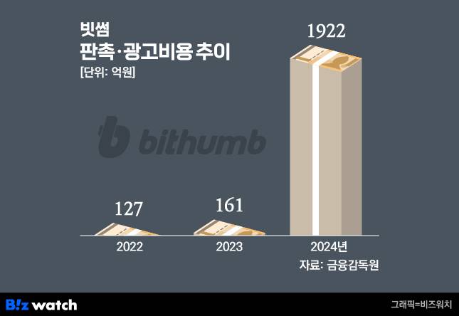 8일 가상자산업계에 따르면 빗썸은 지난해 판매촉진비 1637억원, 광고선전비 285억원 등 마케팅 비용으로 1922억원을 썼다. 지난해 매출액 4963억원의 약 40%에 달하는 금액이다.