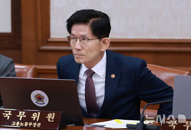 [서울=뉴시스] 최진석 기자 = 김문수 고용노동부 장관이 8일 정부서울청사에서 열린 국무회의에 참석하고 있다. (대통령실통신사진기자단) 2025.04.08. myjs@newsis.com