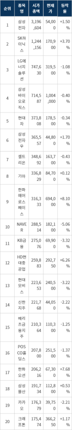 NAVER(035420)는 5.06% 하락하며 가장 큰 하락폭을 기록하고 있으며, LG에너지솔루션(373220)은 1.08% 하락 중이다. 삼성바이오로직스(207940)와 현대차(005380)는 각각 0.40%와 0.34% 하락하며 거래되고 있다. 한화에어로스페이스는 8.10% 상승으로 가장 큰 상승폭을 보이고 있으며, 삼성전자우(005935)와 기아(000270)는 각각 1.70%, 0.12% 상승세를 기록 중이다.
