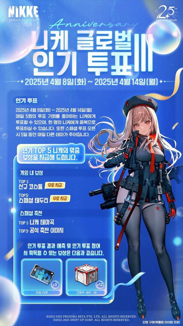 두근두근! 니케 글로벌 인기 투표 III는 4월 8일부터 14일까지 7일 동안 이어진다. 유저들은 매일 스페셜 투표에 참여할 수 있으며 결과는 2.5주년 글로벌 라이브 방송에서 공개된다.