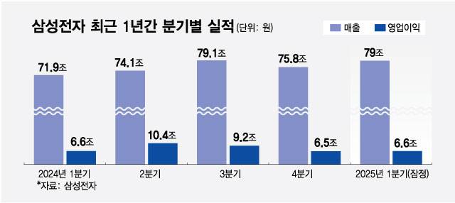 삼성전자가 8일 발표한 1분기 잠정 실적(매출 79조원, 영업이익 6조6000억원) 선방 이유로 '갤럭시 판매 호조'와 미국 관세 부과에 대비한 '반도체 미리 사두기'가 꼽힌다.