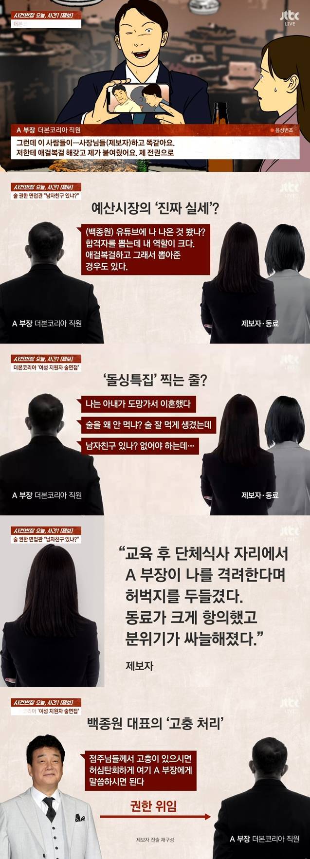 A씨는 여성 면접자에게 "술을 잘 드시게 생겼는데 못 드시냐"고 묻거나, 백종원 대표의 영상을 보여주며 "제가 이렇게 뵙게 해드린다. 대표님"이라고도 말했다. 자신의 전권으로 잘못한 직원이 잘리지 않은 일화도 말하며 본인이 특혜를 줬다고도 했다. 술자리 면접에 대해 "전 술을 잘 못 먹는다. 대표님은 술만큼 좋은 게 없다고 한다"고 설명하기도 했다.