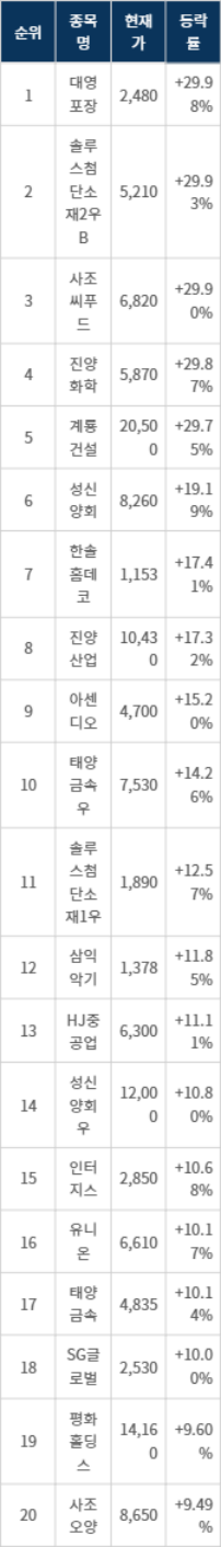 6위 성신양회(004980)는 종가 8,260원으로 19.19% 급등 마감했다. 7위 한솔홈데코(025750)는 종가 1,153원으로 17.41% 급등 마감했다. 8위 진양산업(003780)은 종가 10,430원으로 17.32% 급등 마감했다. 9위 아센디오(012170)는 종가 4,700원으로 15.20% 급등 마감했다. 10위 태양금속우(004105)는 종가 7,530원으로 14.26% 급등 마감했다.