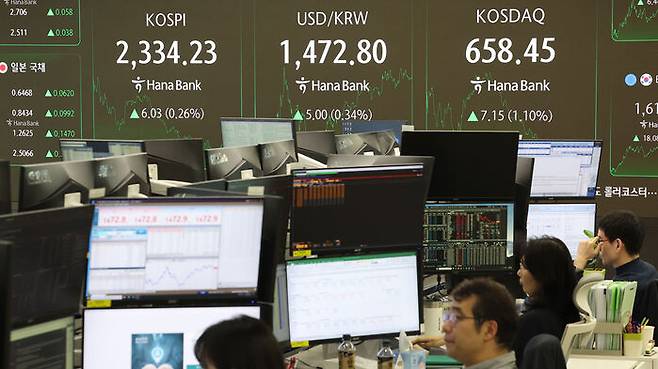 ▲ 8일 오후 서울 중구 하나은행 본점 딜링룸 현황판에 코스피, 원/달러 환율, 코스닥 지수가 표시돼 있다.