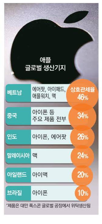 중국을 제외하면 에어팟·아이패드·애플워치·맥 등 가장 많은 애플 제품이 생산되는 국가는 베트남이지만 상호관세율이 46%에 달한다. 다만 베트남 정부가 미국과 협상에 적극 나서고 있어 현재보다 낮아질 가능성이 있다. 말레이시아는 관세율이 24%로 맥을 생산하고 있다. 유럽에서는 아일랜드에서 아이맥이 일부 생산되며 관세율 20%가 적용된다.