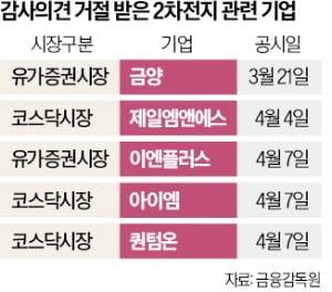 앞서 다른 2차전지 상장사인 금양과 제일엠앤에스도 감사의견 거절을 공시했다.
