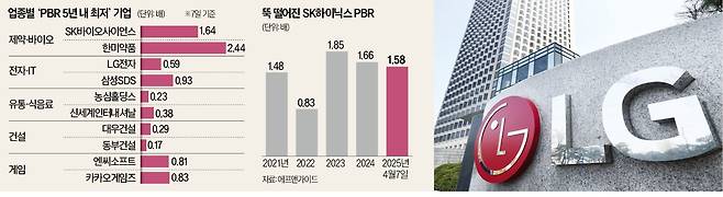 제약·바이오 업종이 대표적이다. 한미약품(2.44배), SK바이오사이언스(1.64배)의 PBR은 5년 만에 최저치를 기록했다. 임상 단계가 주가를 좌우하는 바이오주는 관세 위험이 낮은데도 낙폭이 컸다는 게 증권가 시각이다. 건설과 유통 부문에선 대우건설(0.29배), 신세계인터내셔날(0.38배) 등의 PBR이 최저였다. 조윤종 TRS투자자문 대표는 “수십조원 규모 추가경정예산이 실제 집행되면 현대건설, 이마트 등 건설과 유통주가 우선 수혜를 볼 수 있다”고 말했다.