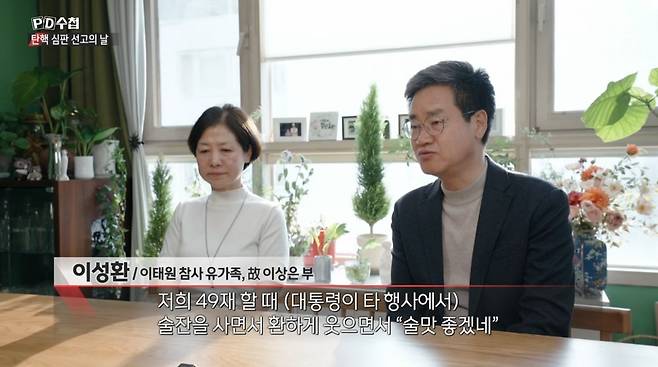 2022년 10월 29일 이태원 참사로 외동딸 상은 씨를 떠나보낸 이성환-강선이 부부는 윤 전 대통령의 비상계엄 이후 탄핵 선고를 간절히 기다려왔다. 강선이 씨는 딸의 영정에 기도를 올리며 "우리 이태원 참사 희생자들의 평화를 위한 기도를 올리고 있다"며 "(대통령을) 파면해야 하는 우리나라를 위해서, 우리나라가 새롭게 변화될 수 있게 국민의 생명 안전이 존중될 수 있게"라고 말했다.