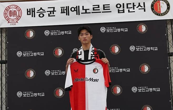 페예노르트는 8일 구단 소셜미디어(SNS)를 통해 배승균 입단을 알리고 그와 3년 계약을 체결했다고 밝혔다. 마침 배승균의 모교인 서울 보인고에서도 입단식이 열렸다.