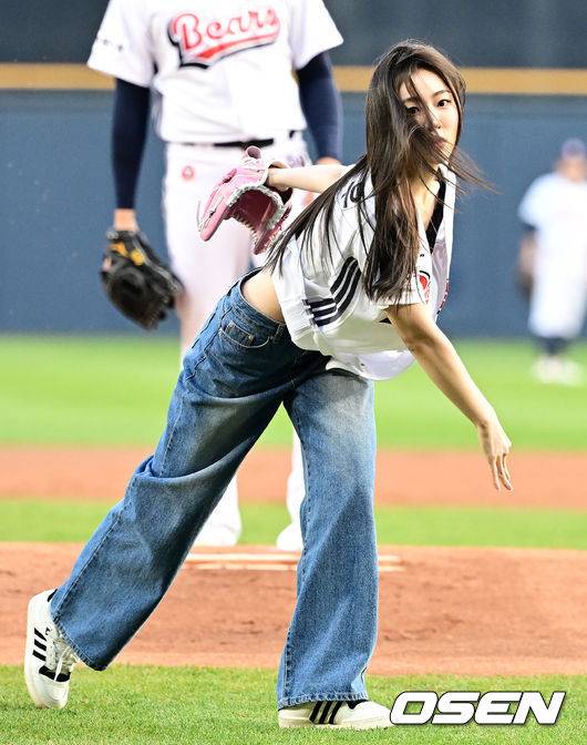 배우 송지우가 시구를 하고 있다. 2025.04.08 / jpnews@osen.co.kr