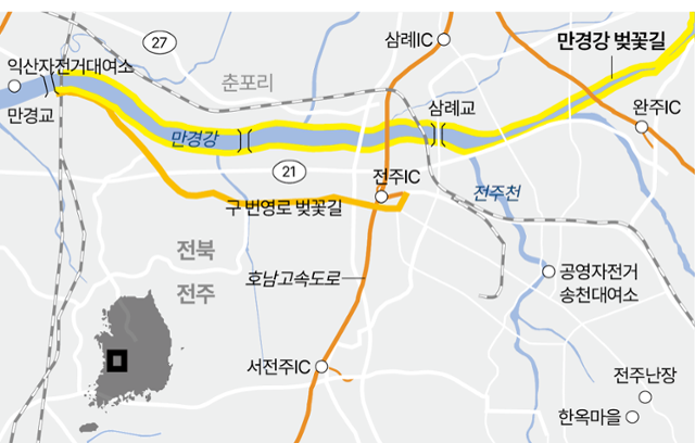 만경강 벚꽃길은 26번 국도가 만경강을 건너는 만경교(익산·김제시)에서부터 강 제방을 따라 완주군 고산면 양화교 인근까지 약 30㎞ 이어진다. 대부분 번영로가 쇠락한 2000년대 초부터 시작된 새만금 유역 생태 숲 조성사업의 일환으로 심은 나무들이다.