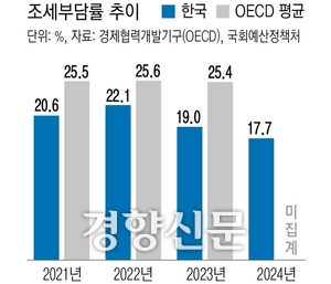 8일 국회예산정책처에 따르면 윤석열 정부 첫해인 2022년에 22.1%였던 조세부담률은 2023년 19%, 지난해에는 17.7%로 하락했다. 2년 사이 4.4%포인트 뚝 떨어진 것이다. 같은 기간 경제협력개발기구(OECD) 평균 조세부담률이 25% 수준을 유지하는 것과 대조적이다.