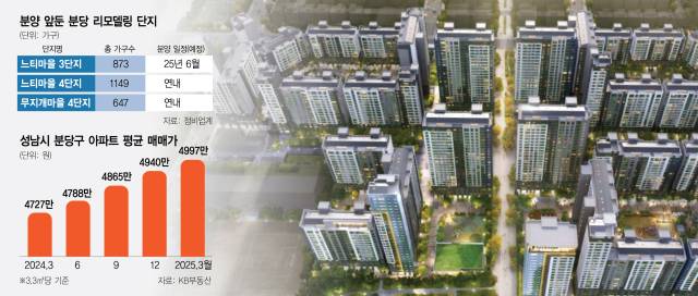 분당에서는 올해 리모델링 신축 단지들의 분양이 줄줄이 예정돼있다. 바로 옆 ‘느티마을 4단지’는 총 1149가구 규모로 들어서며, 이 중 143가구를 일반 분양할 예정이다. 현재 시공사와 공사비 인상을 두고 협상을 벌이고 있으며, 아직 분양가 수준은 정해지지 않았다. 협상 결과에 따라 3.3㎡당 6000만 원에 육박할 것이라는 예상이 나온다. 총 647가구 규모로 들어서는 구미동 ‘무지개마을 4단지’도 연내 분양을 준비 중이다.
