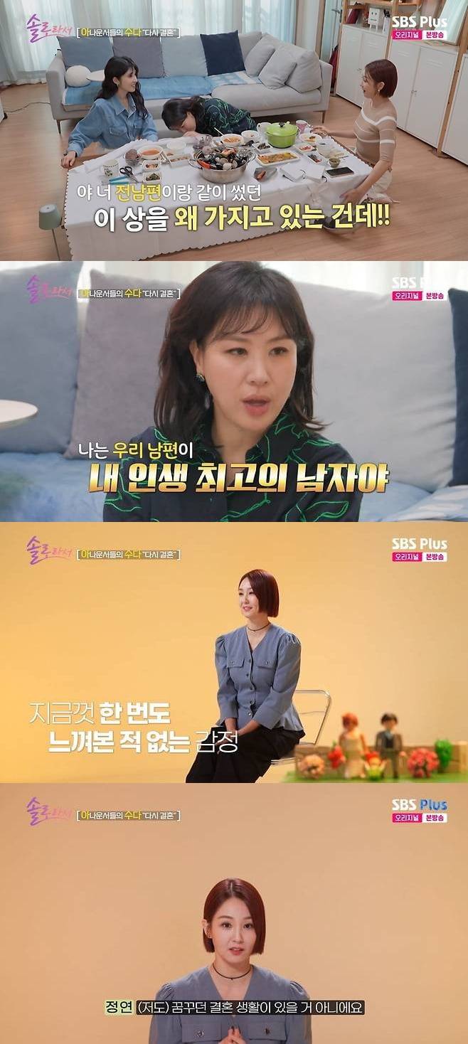 지난 8일 방송된 SBS Plus·E채널 예능 '솔로라서'에서는 오정연이 전 아나운서 김경란, 김성경을 새집으로 초대해 재혼에 대해 솔직한 이야기를 나누는 모습이 담겼다.