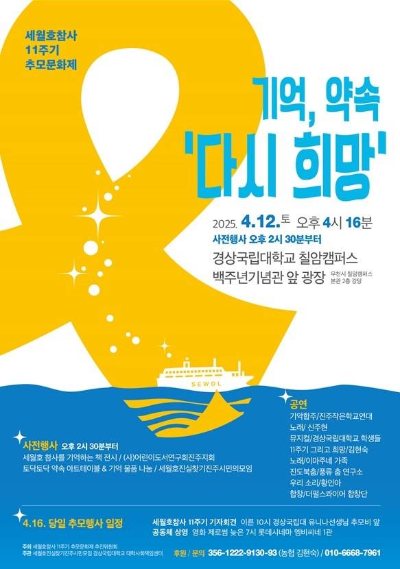 세월호진실찾기진주시민의모임을 비롯한 경남 진주시민들이 세월호 참사 11주기를 맞아 "기억, 약속 '다시 희망'"을 내걸고 다양한 추모활동을 벌인다.
