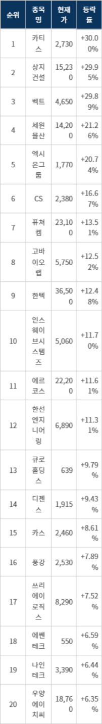 6위 CS(065770)는 현재가 2,380원으로 16.67% 상승 중이다. 7위 퓨쳐켐(220100)은 현재가 23,100원으로 13.51% 상승 중이다. 8위 고바이오랩(348150)은 현재가 5,750원으로 12.52% 상승 중이다. 9위 한텍(098070)은 현재가 36,500원으로 12.48% 상승 중이다. 10위 인스웨이브시스템즈(450520)는 현재가 5,060원으로 11.70% 상승 중이다.