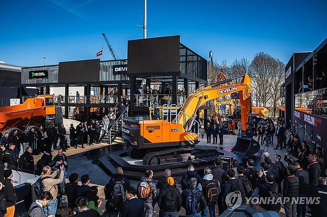 (서울=연합뉴스) HD현대건설기계와 HD현대인프라코어가 지난 7일(현지시간)부터 오는 13일까지 독일 뮌헨에서 열리는 세계 최대 건설기계 박람회인 'BAUMA 2025'에 참가한다고 9일 밝혔다. 사진은 바우마 2025에 참가한 HD현대인프라코어 부스 전경. 2025.4.9 [HD현대 제공. 재판매 및 DB 금지]