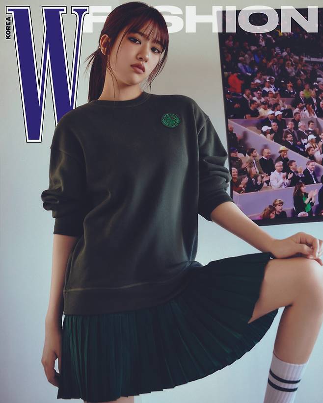 화보에서 안유진은 플리츠 디테일이 가미된 스웻셔츠 드레스로 스포티하면서도 세련된 분위기를 연출했으며, 레이어드 디자인의 립 칼라 재킷으로 시크한 스타일을 완성했다.