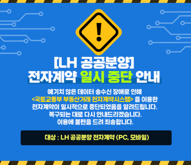 9일 LH는 수원 당수 A5블록 신혼희망타운 당첨자들에게 공공분양 전자계약이 일시 중단됐다고 안내했다. LH는 “예기치 않은 데이터 송수신 장애로 인해 국토교통부 부동산거래 전자계약 시스템을 이용한 전자계약이 일시적으로 중단됐다”며 “이용에 불편을 드려 죄송하다”고 밝혔다.