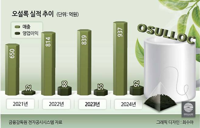 외면받던 시절과 달리 이제 국내에서도 차 시장은 꾸준히 성장 중입니다. 글로벌 시장조사기관 유로모니터에 따르면 2020년 1조1000억원 규모에서 지난해 1조5800억원까지 커졌습니다. 그동안 오설록의 실적도 상승곡선을 그렸습니다. 2020년 477억원이었던 매출은 지난해 937억으로 2배 가까이 뛰었습니다. 같은 기간 9267만원이었던 영업이익은 지난해 92억원을 기록했습니다. 특히 코로나19 이후 홈카페 문화가 본격화한 2021년에는 매출과 영업이익이 각각 650억원, 32억원으로 전년(2020년) 대비 무려 36.2%, 3386.3% 뛰기도 했습니다. 초기 매출이 수천만 원에 불과했던 오설록이 이제는 영업이익마저 억 단위로 늘어나게 된 겁니다.