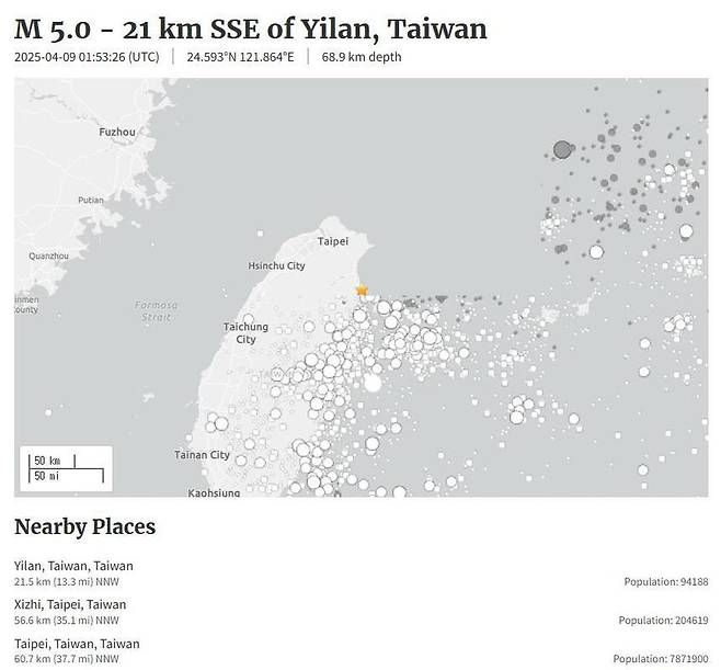 [대만 북동부 5.0 규모 지진 (미국 지질조사국(USGS) 홈페이지 캡처=연합뉴스)]